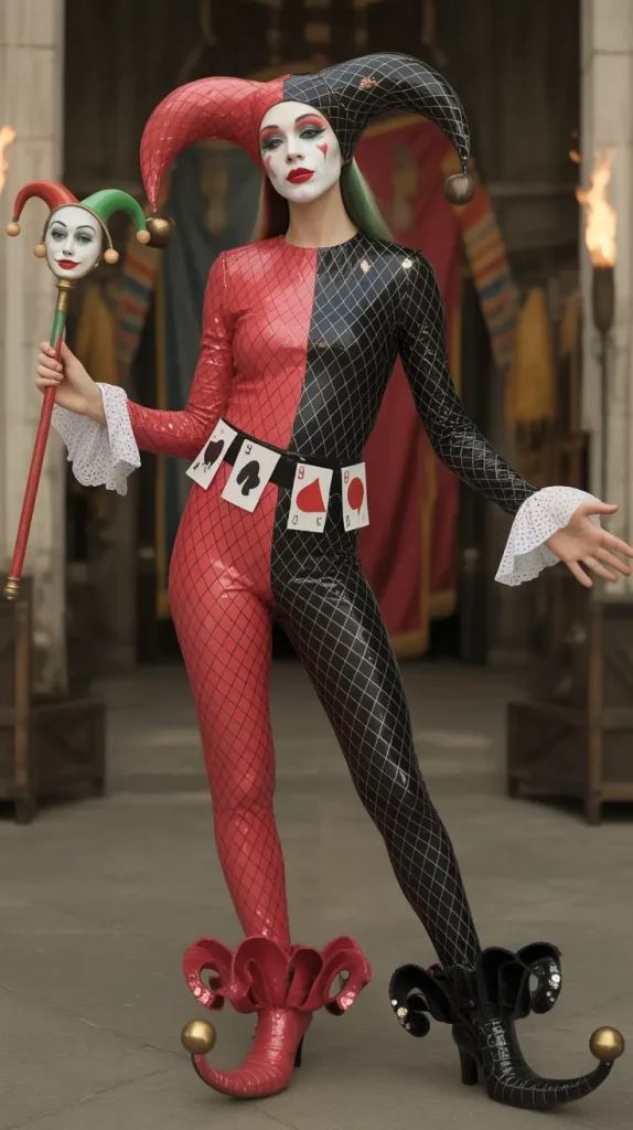 This one screams theatrical. A diamond-pattern bodysuit in red and black with a floppy hat and bells makes for a dramatic, bold look. Itβs a nod to medieval jesters but with Halloween flair. Donβt you love when costumes feel historical and fun at the same time? Add exaggerated eyeliner or glitter for a chic touch. Itβs a clown costume women can rock if they want something bold but not too creepy.