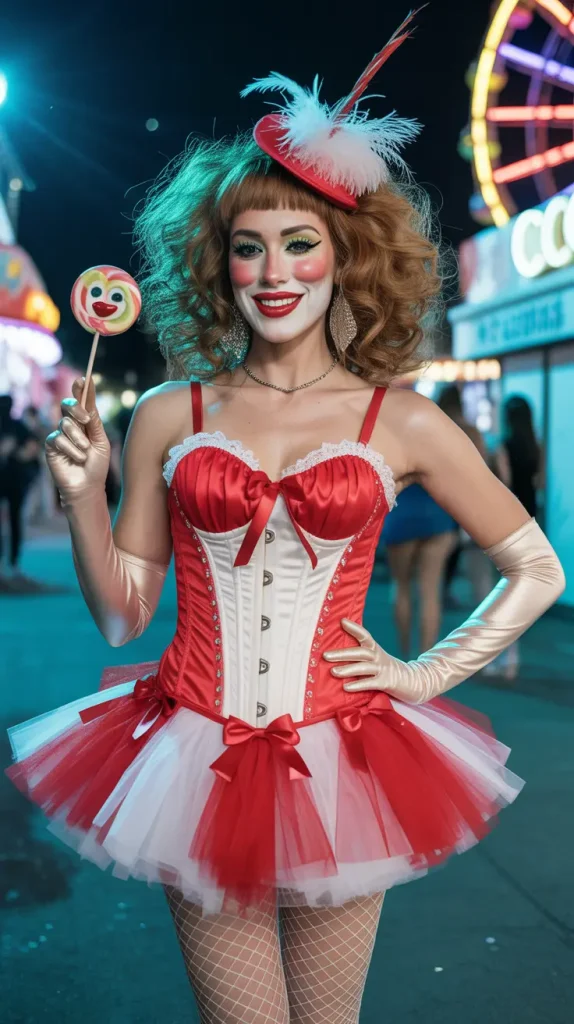 Want a sultrier spin? The Sexy Corset Clownette delivers. A red-and-white corset dress with fishnet tights and dramatic heels instantly brings the heat. Pair it with bold, exaggerated clown makeup and maybe a whip or cane for props. Isnβt it fun when Halloween lets you lean into bold confidence? This is the perfect clown Halloween costume if you want to flirt with a dramatic entrance. IMO, it works especially well for parties where you want to mix spooky with glam.
