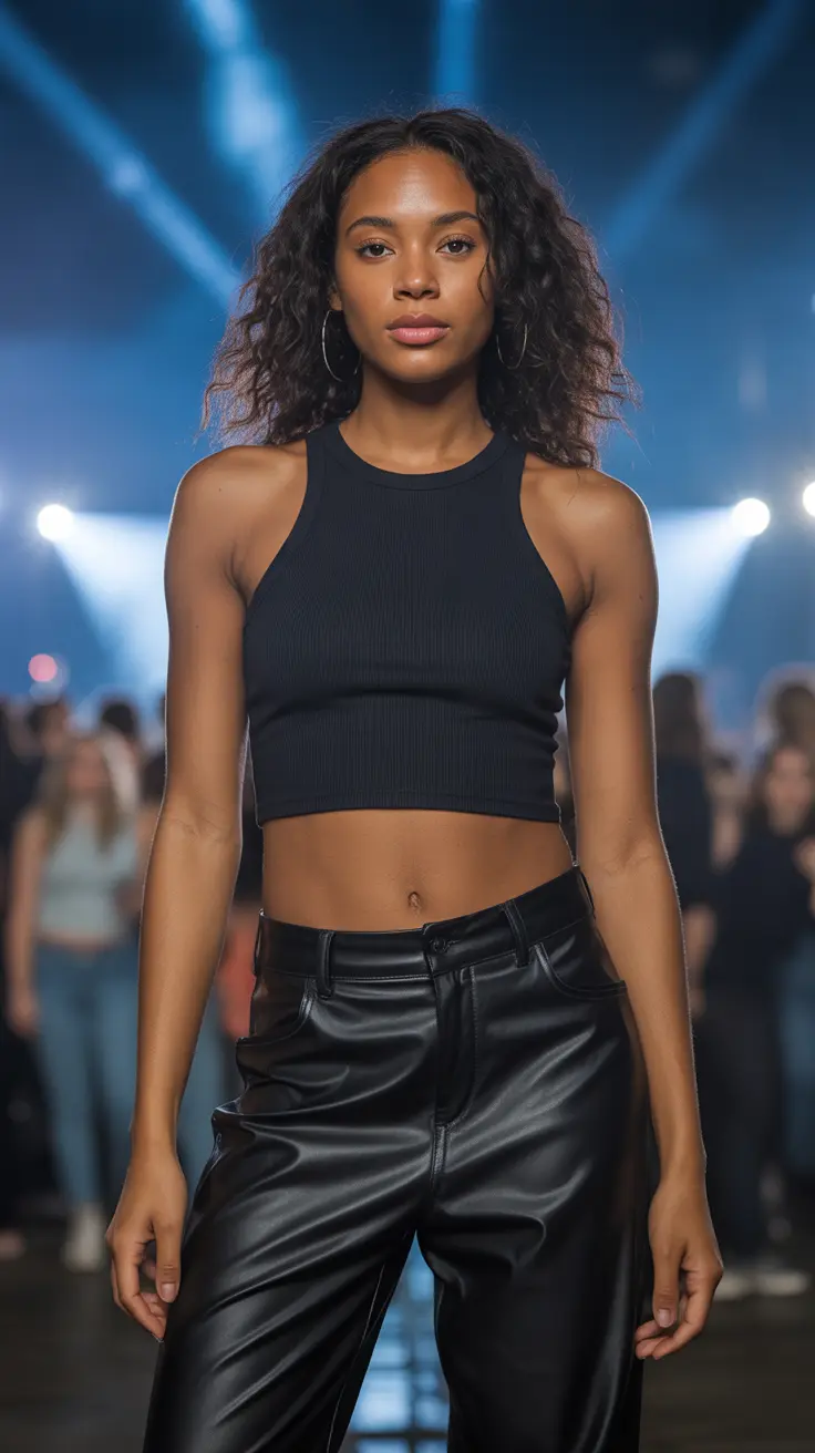 In the image, a woman showcases this trendy look effortlessly. Her fitted leather pants hug her curves, while the metallic crop top adds a touch of shine. This combination is not only stylish but also comfortable for dancing and enjoying the music.