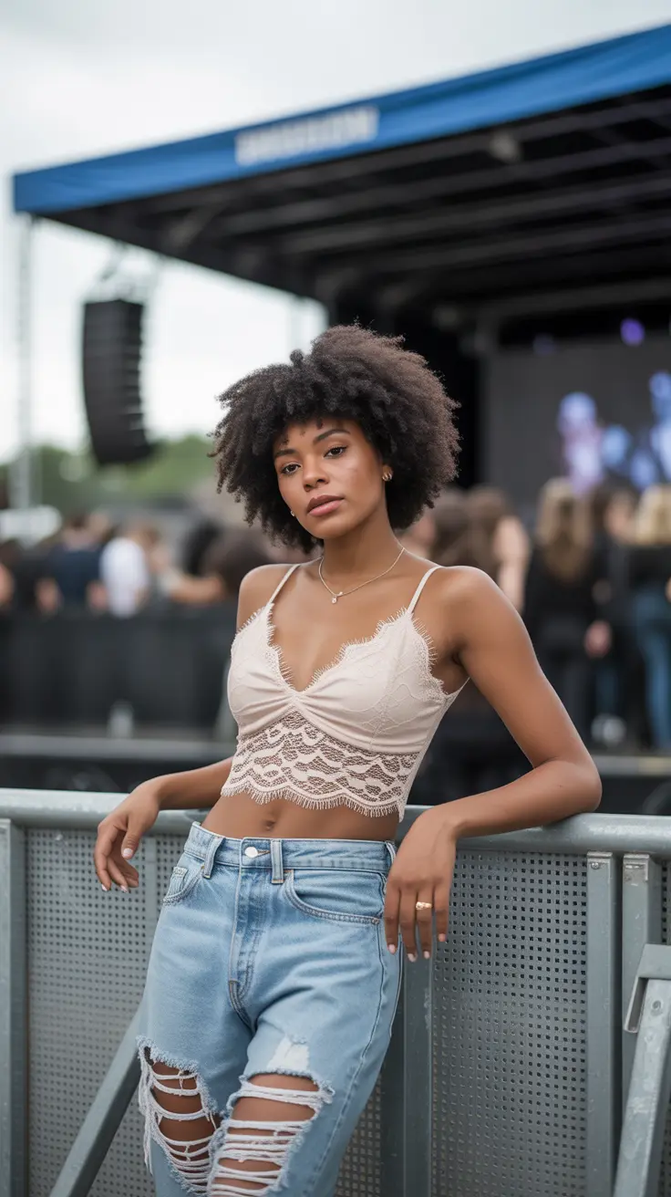 Lace tops paired with distressed jeans create a stunning look that’s perfect for concerts. This outfit strikes a balance between edgy and feminine, making it a go-to choice for Black women looking to express their style.