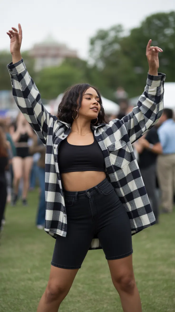 Biker shorts paired with an oversized flannel shirt make for a trendy look that’s perfect for concerts. This outfit strikes a balance between comfort and style, allowing you to move freely while looking chic.
