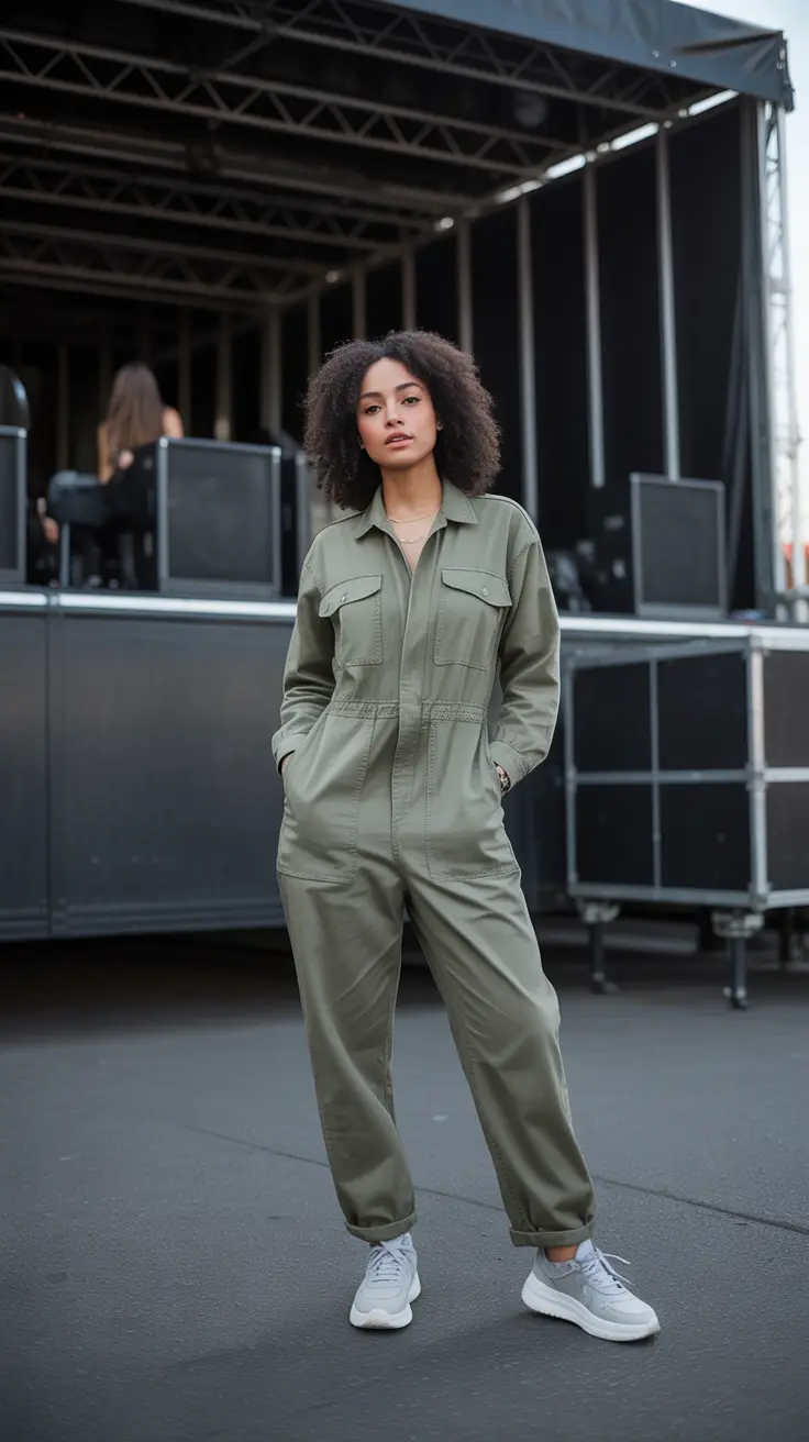 A utility jumpsuit paired with sneakers is a fantastic choice for concert-goers looking for comfort and style. This outfit strikes the perfect balance between laid-back and chic, making it ideal for a festival or concert setting.