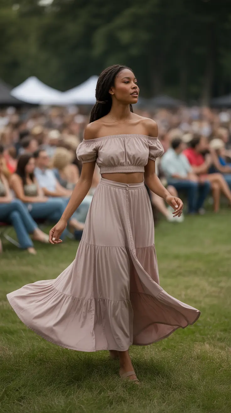 When it comes to concert outfit ideas for Black women, an off-shoulder top paired with a maxi skirt is a winning combo. This look is not only stylish but also super comfortable for those long hours of dancing and enjoying the music.