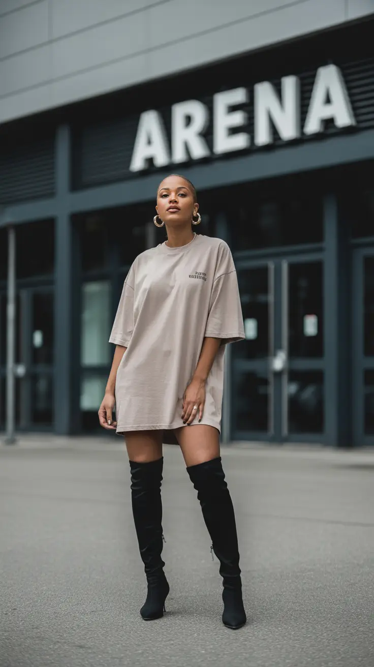 The oversized tee and thigh-high boots combo is a bold choice for any concert. This look is both comfy and stylish, making it perfect for dancing the night away. The oversized tee adds a relaxed vibe, while the thigh-high boots bring a touch of edge.