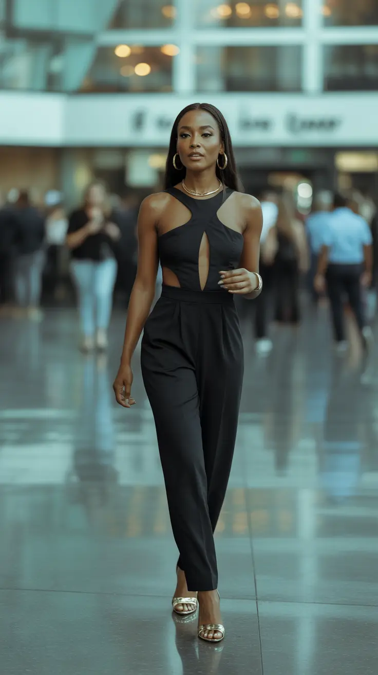 The jumpsuit features chic cutouts that add a modern twist, allowing for a mix of elegance and edge. The deep black color serves as a versatile base, while the gold heels elevate the entire outfit, adding a touch of glam that catches the eye.