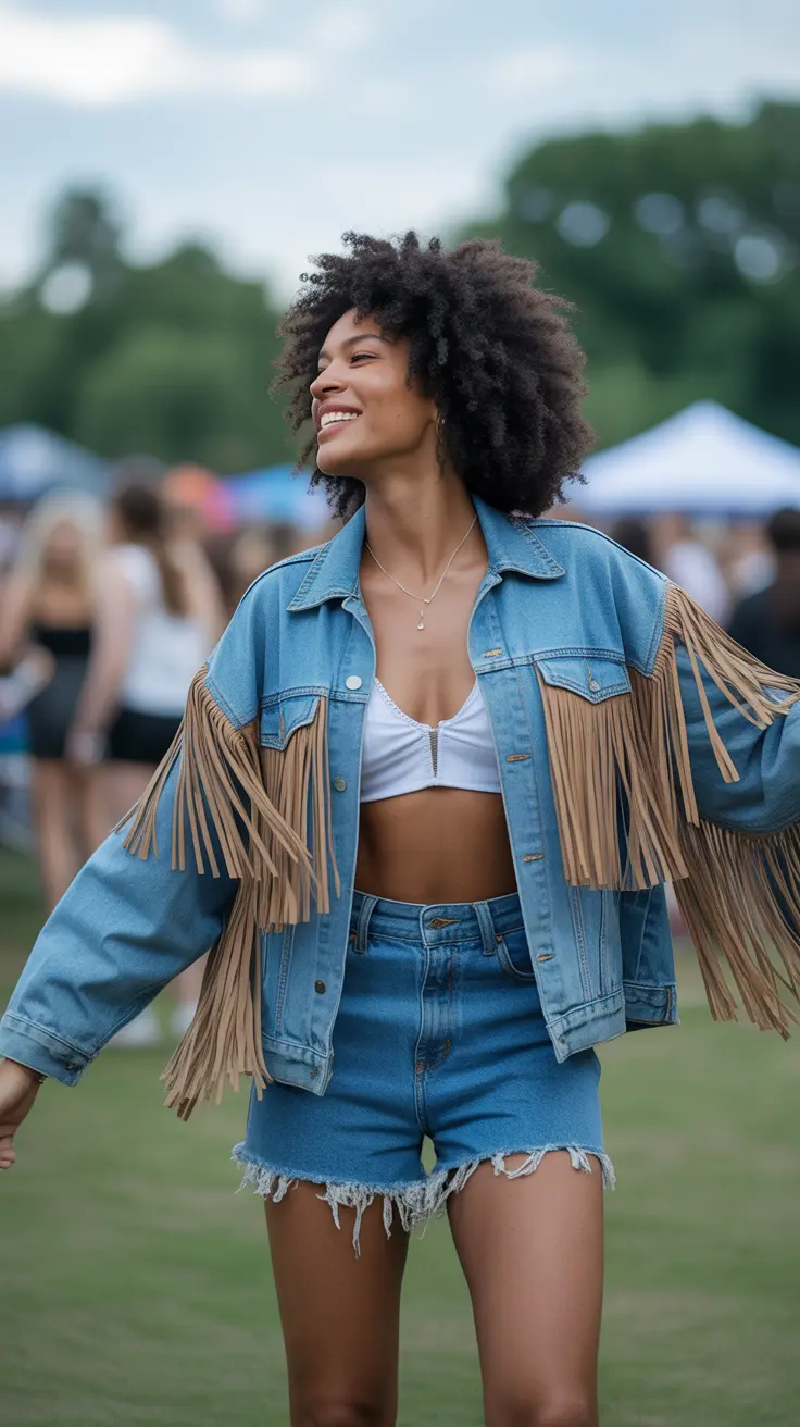 Denim shorts paired with a fringe jacket is a standout choice for any concert. This combo is not just stylish; it’s also super comfortable, making it perfect for dancing and enjoying the music.