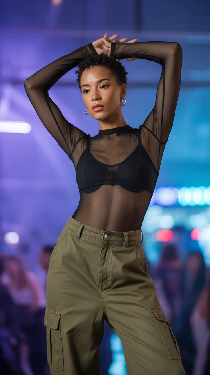 When it comes to concert outfit ideas for Black women, a mesh bodysuit paired with cargo pants is a standout choice. This look is not just trendy; it’s bold and ready to turn heads in any crowd.