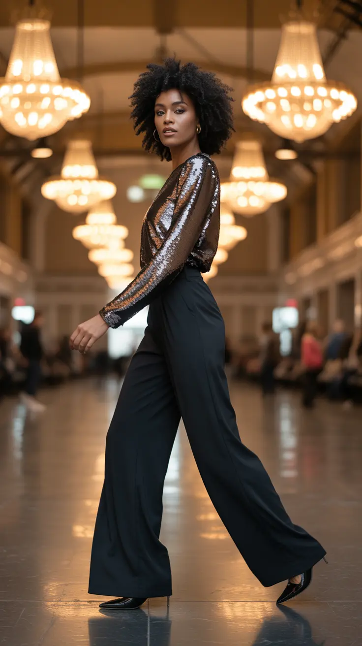 The sequined top adds a touch of sparkle, catching the light as you move. It’s a great way to express your personality and shine in a crowd. The wide-leg pants balance the outfit, offering comfort and style without sacrificing flair.