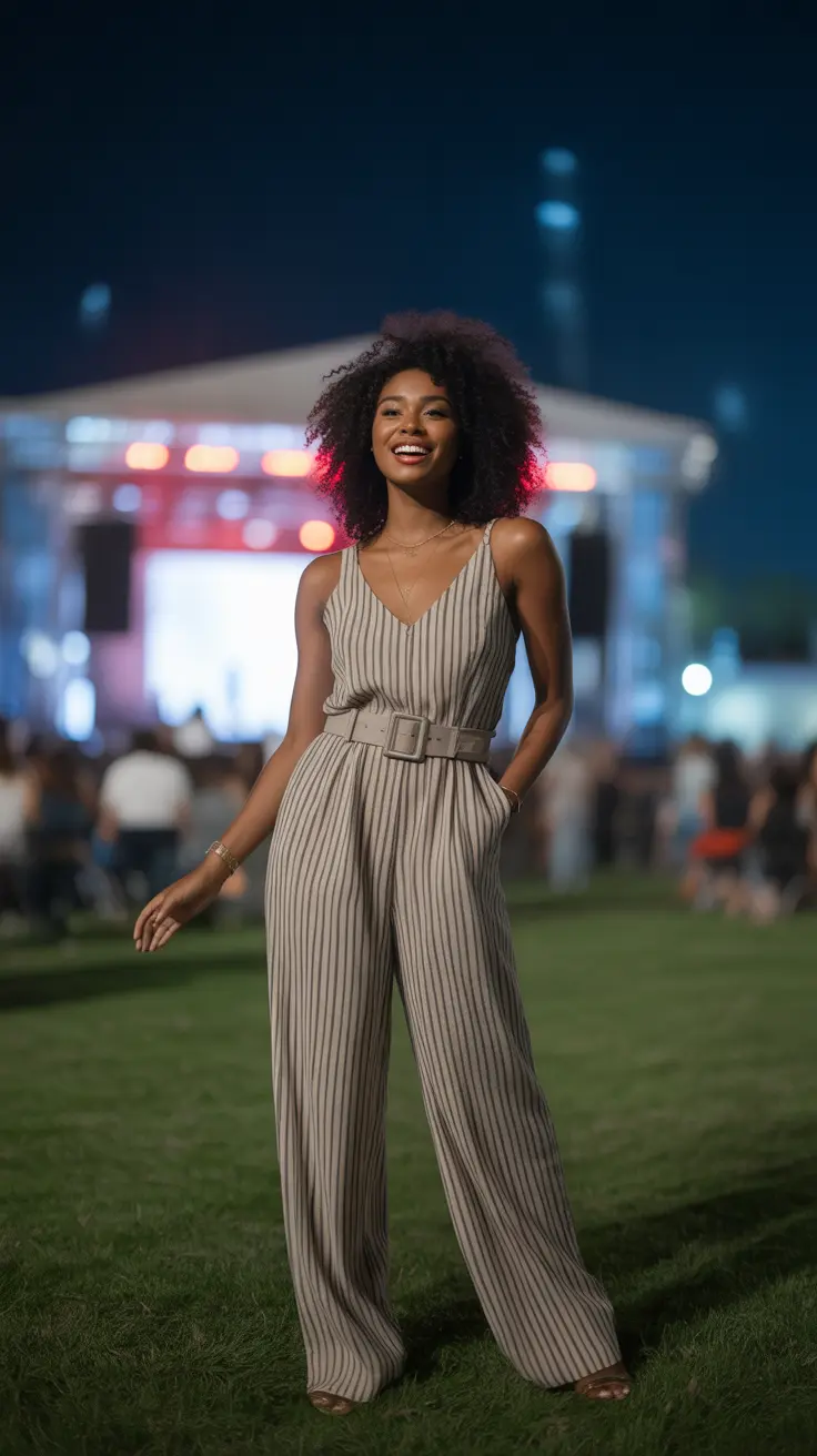 Accessorizing with statement earrings can further enhance this trendy look for concerts. The combination of the jumpsuit and heels creates a confident vibe, perfect for dancing the night away or enjoying live music.