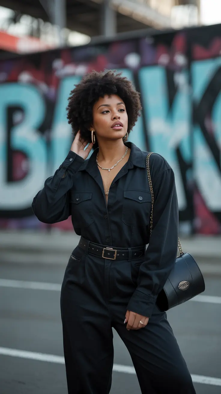 The jumpsuit’s structured design adds a trendy edge, while the sneakers keep you ready to dance and move. This look is not only practical but also showcases bold outfit inspo that Black women can rock effortlessly.