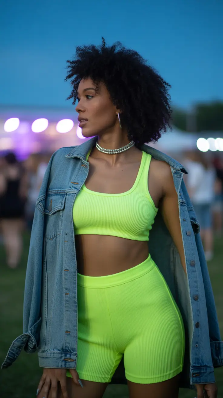 The denim jacket adds a layer of coolness, balancing the brightness of the neon. It’s a versatile piece that works well for those cooler concert nights. This outfit is not just stylish; it’s also comfortable, making it ideal for dancing and enjoying the music.