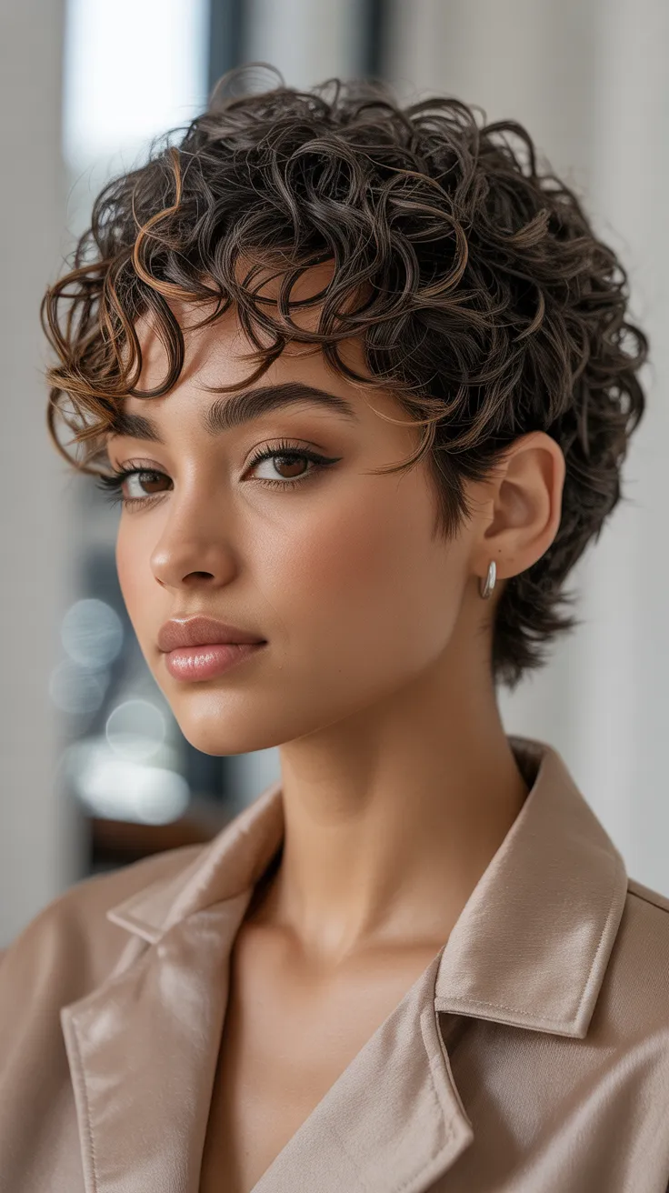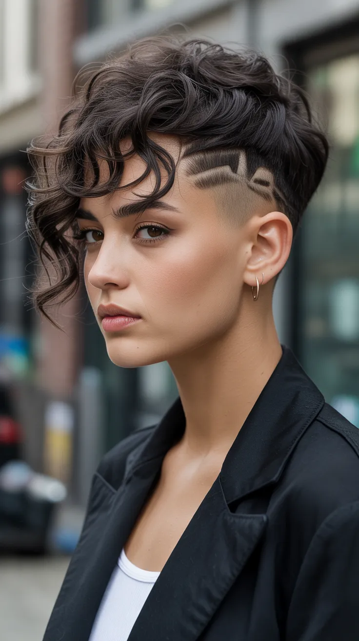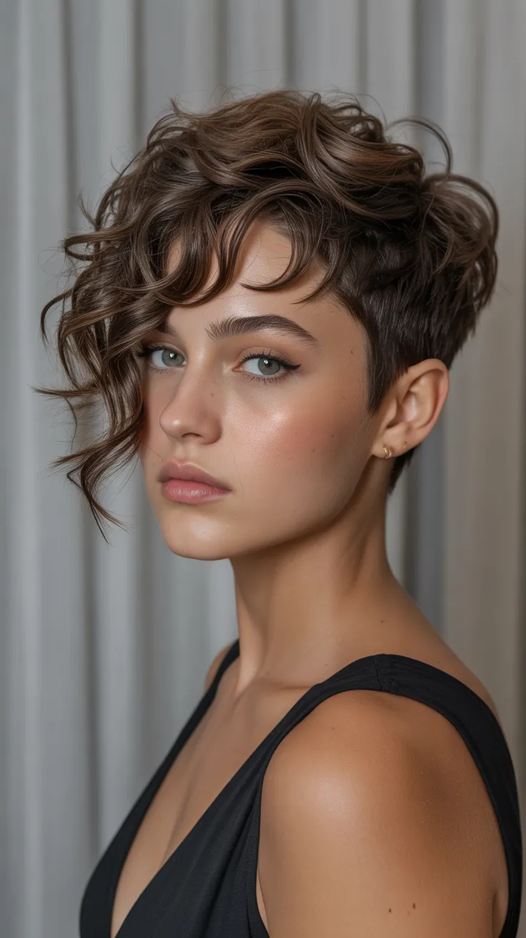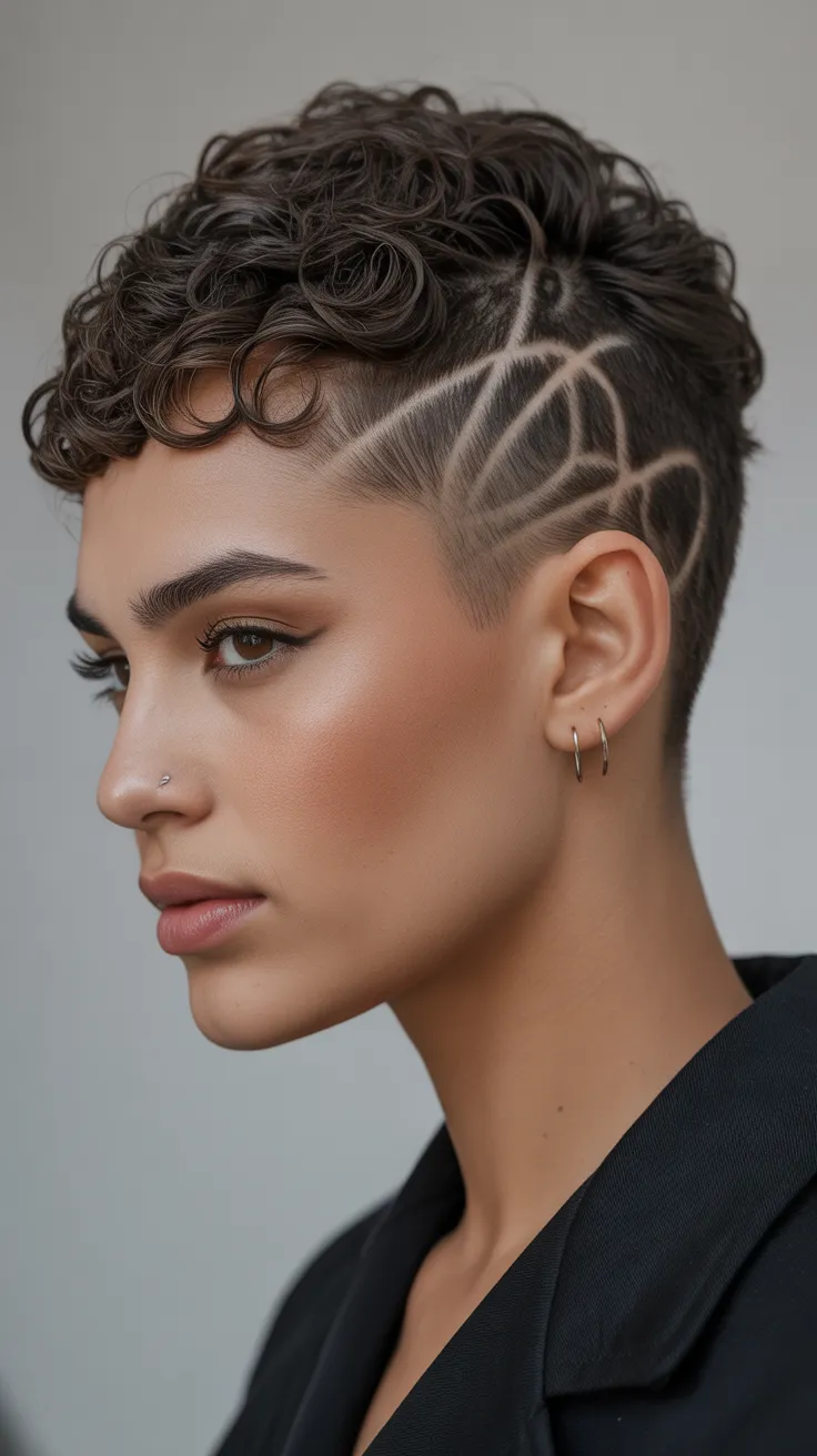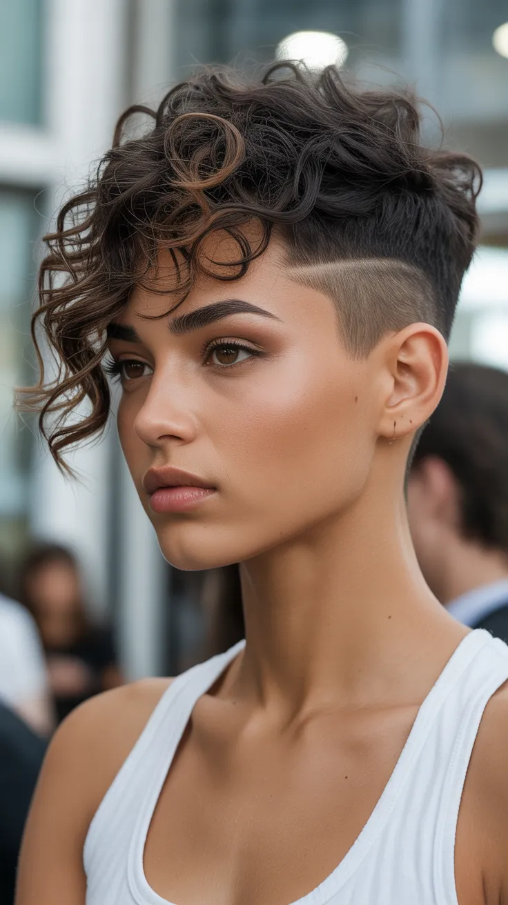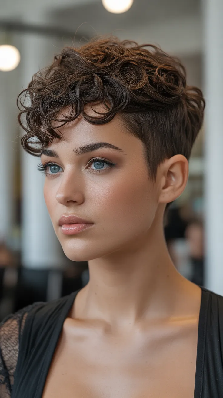 This brunette curly cut is a fun twist on short curly hair. The side shave adds a bold touch, making it perfect for those who love to express their personality through their hairdos. Whether you’re into curly pixie hairstyles or just want to switch things up, this look is sure to turn heads!