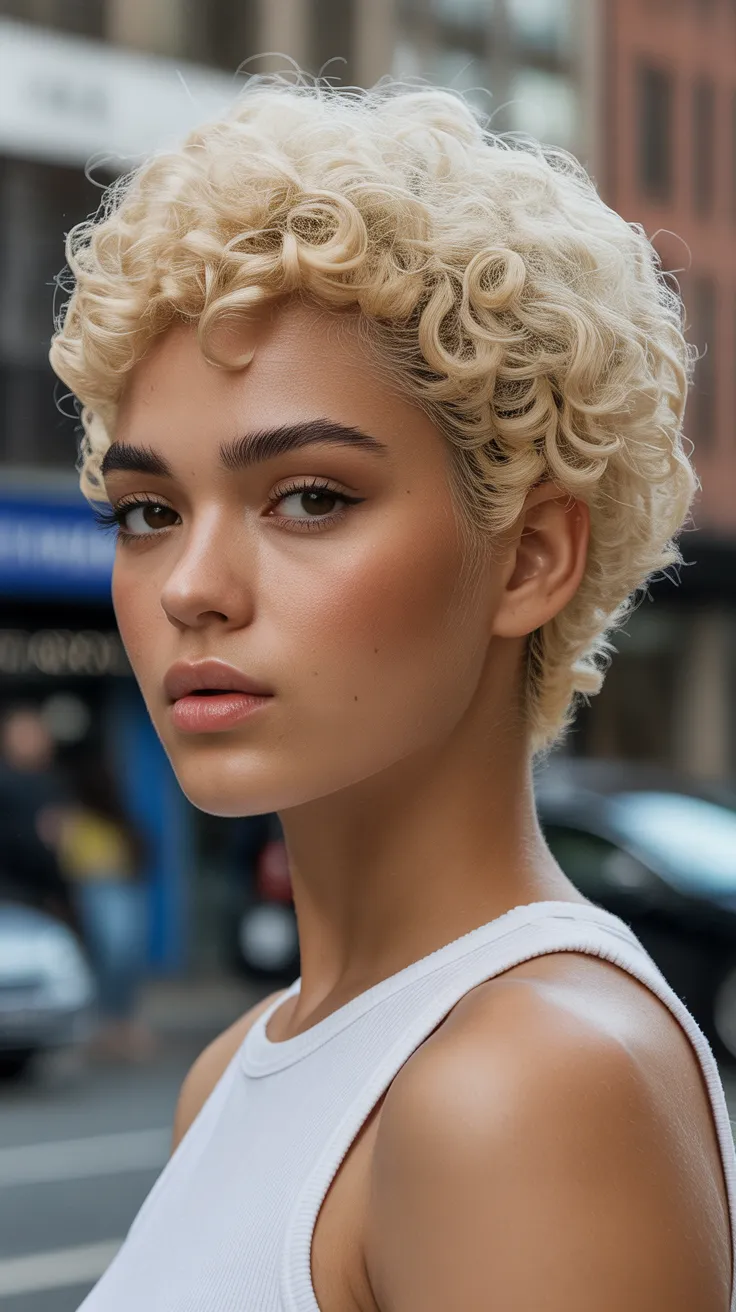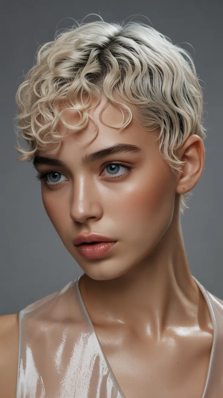 This platinum curly crop is a stunning choice for anyone looking to make a statement. The wet look finish adds a fun twist, giving the hairdos for curly hair a fresh and modern vibe. Perfect for those who love short curly hair, this style is all about confidence and personality!