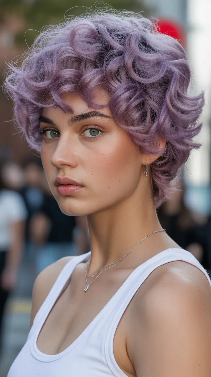 This lavender curly crop is a fun and playful choice for anyone looking to switch up their look. The defined texture adds a bold flair, making it one of the standout hairdos for curly hair. Perfect for those who love short curly hair, this style is both vibrant and full of personality!