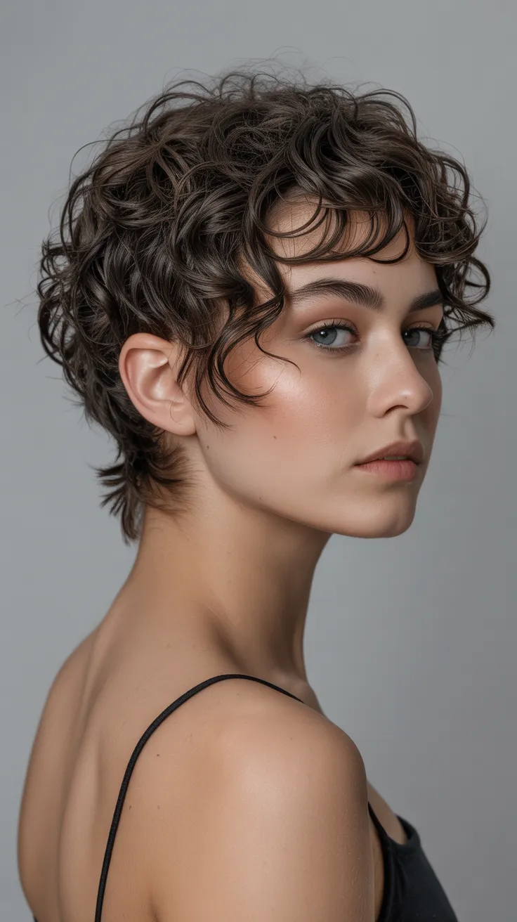 This curly pixie mullet is a fun twist on short curly hair. The nape detail adds a unique touch, making it a standout choice among curly queer hairstyles. Perfect for those who want a bold look that showcases their personality!