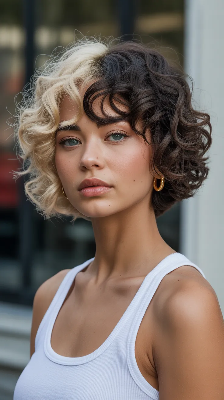 This two-tone curly bob is a fun twist on short curly hair. The vibrant colors add personality and flair, making it a standout choice for anyone looking to express themselves. With a middle part and bouncy curls, this hairdo is perfect for those who love curly queer hairstyles that are both stylish and playful.