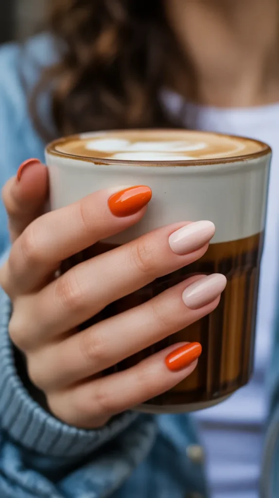 Pumpkin orange alternating with creamy nude nails is a match made in autumn heaven. Itβs festive, cozy, and a little playful perfect for Thanksgiving gatherings or pumpkin patch trips. The balance of bold and soft tones makes the manicure versatile and stylish. You can dress it up or down depending on the day. This duo is basically fall in a manicure. π