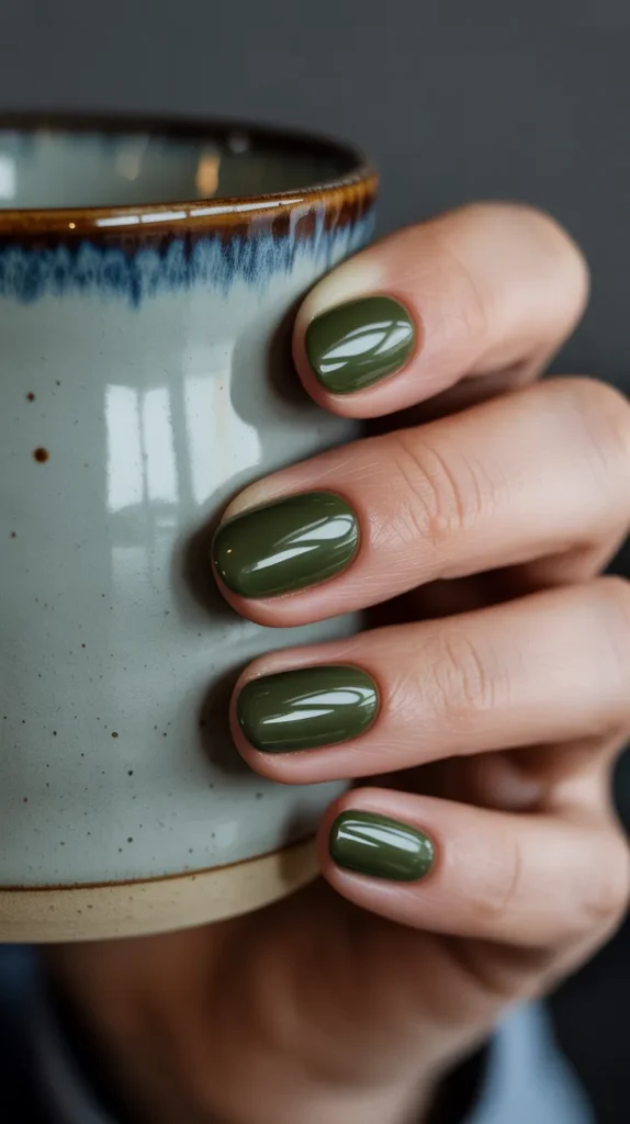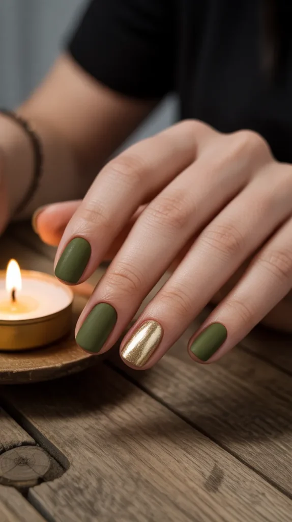 Olive matte nails instantly feel cozy, but add a gold foil accent and they become something special. That single shimmer detail elevates the whole look without making it too flashy. Itβs one of those small details people will notice and compliment. Perfect if you want trendy nails that are equal parts casual and luxe. Honestly, this combo is autumn perfection. β¨