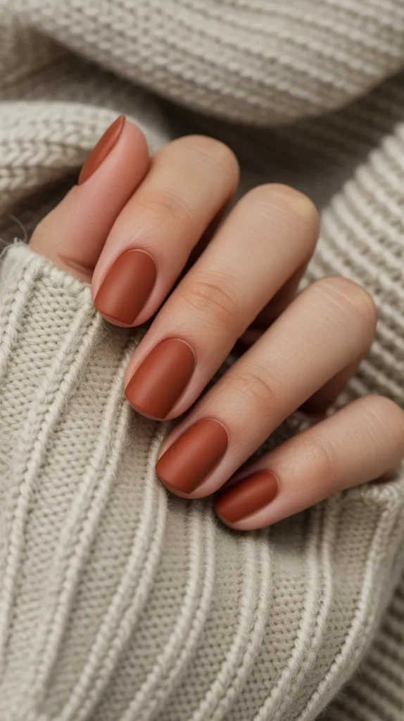 Terracotta nails give major autumn energy with their warm, clay-inspired tone. The matte finish adds extra coziness, making them feel soft and seasonal. Theyβre bold enough to stand out but still muted enough to wear daily. Pair them with chunky scarves and leather boots for the ultimate fall aesthetic. π This is one shade that always feels right for October.
