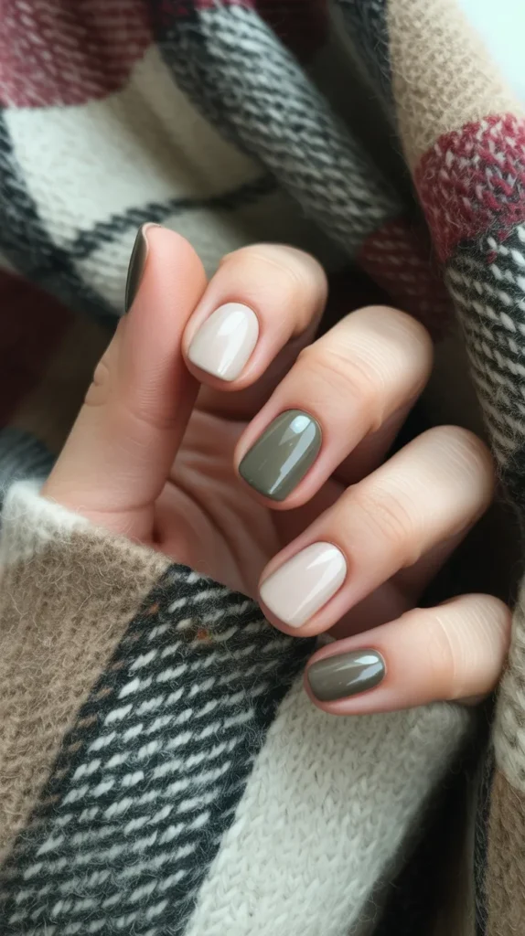 Why choose one shade when you can rock two? Alternating beige and muted olive nails gives a two-tone manicure that feels trendy but still balanced. The combo is neutral enough to go with almost any outfit. Plus, the mix keeps your nails from ever feeling boring. πΏ Itβs an easy way to show off autumn nails with minimal effort.