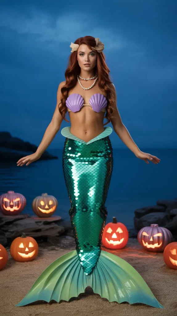 A mermaid look is all about shimmer and sparkle. 🧜♀️ A sequin tail skirt, seashell top, and pearl jewelry make this one of the most magical unique Halloween costumes. Add a long wavy wig and glittery body makeup for extra glam. This is perfect if you want to channel ocean vibes with a Halloween twist. It’s bold, pretty, and unforgettable. Pair it with an ocean backdrop or shell props to really bring it to life.