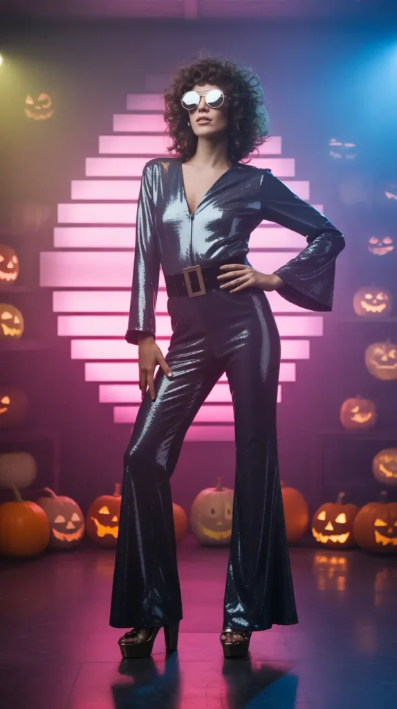 Shine bright like it’s the 70s with a glitter jumpsuit and platform heels. ✨ Big curls and oversized sunglasses make this look glamorous and bold. It’s one of those solo Halloween costumes that’s all about sparkle and confidence. Add disco lights or glitter props to really bring the vibe together. Perfect for anyone who loves retro fashion with a fun twist. Chic, unique, and totally party-ready.