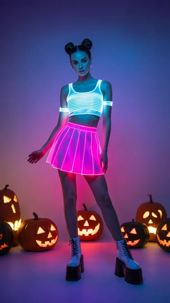 For futuristic flair, go all out with a glowing LED look. A neon skirt, cropped top, and platform boots create instant drama. 💡 Add sleek space buns or glitter makeup for extra flair. This is one of the most eye-catching pretty Halloween costumes you can wear. It’s perfect for rave-style parties or anyone who wants to shine all night. It’s bold, creative, and full of personality.