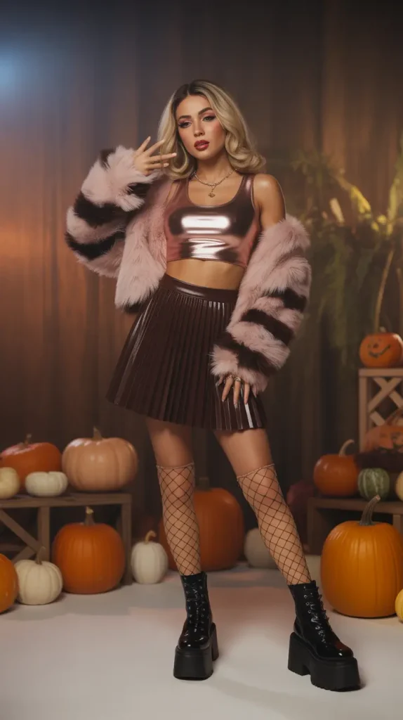 If you don’t want to go in a group, a solo Bratz-inspired costume is just as fabulous. A metallic crop top, pleated skirt, and chunky boots are all you need. 💄 Add Y2K makeup with glossy lips and smoky eyes to complete the look. This is one of those solo Halloween costumes that’s trendy and totally fun. It’s perfect if you want something bold, stylish, and still cute. A Halloween runway backdrop makes it even more striking.