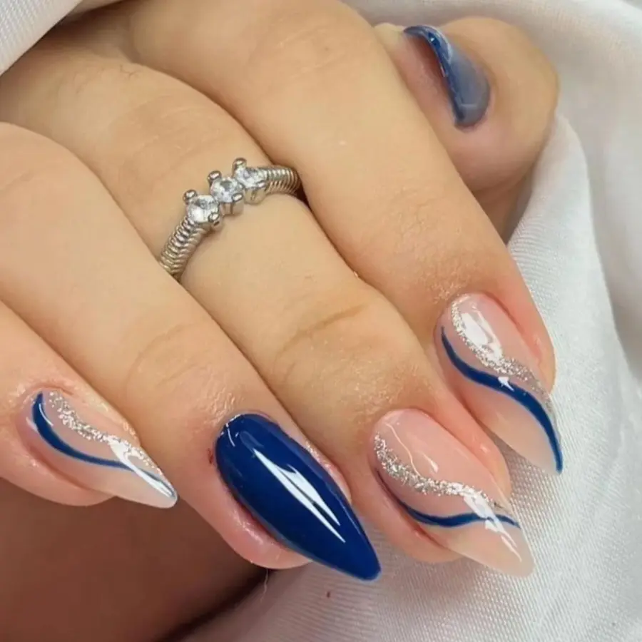 This design pairs deep blue polish with white and glitter accents for a clean yet eye-catching look. The mix of textures keeps the manicure interesting while maintaining a calm, wearable feel. A great choice for dark blue nails that still feel light and stylish.