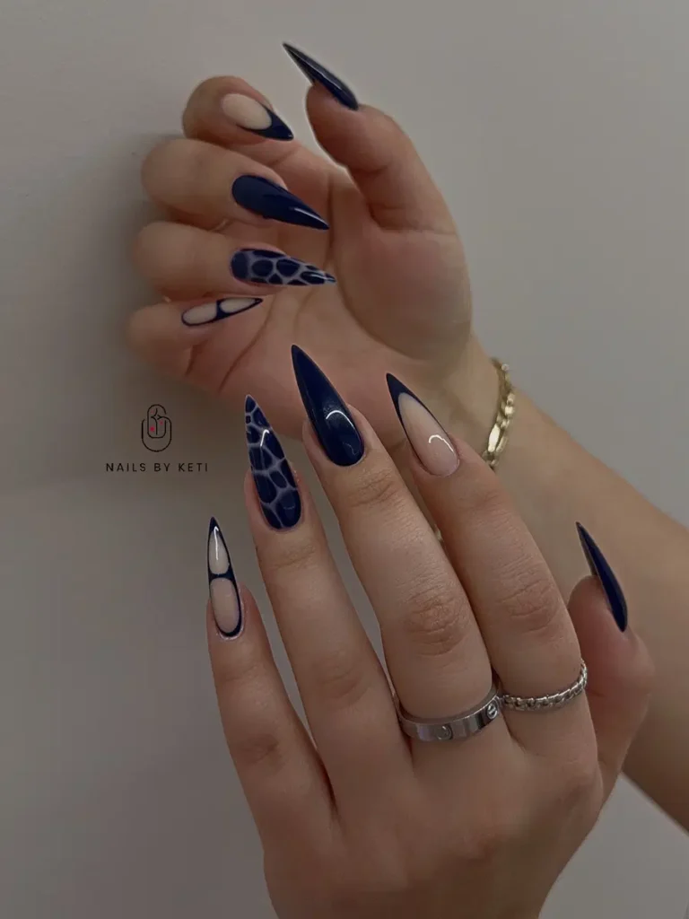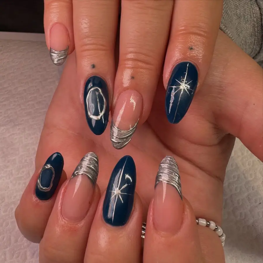 This design blends soft nude bases with crisp navy blue French tips, finished with elegant silver line details and tiny star accents. The contrast feels refined rather than dramatic, giving the manicure a balanced, modern edge. A great option for dark blue nails that feel artistic yet clean and intentional.