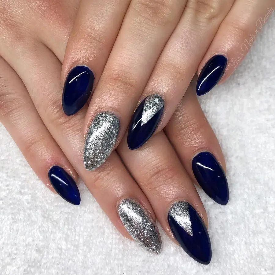 8. Dark Blue Almond Nails With Silver Chrome Statement