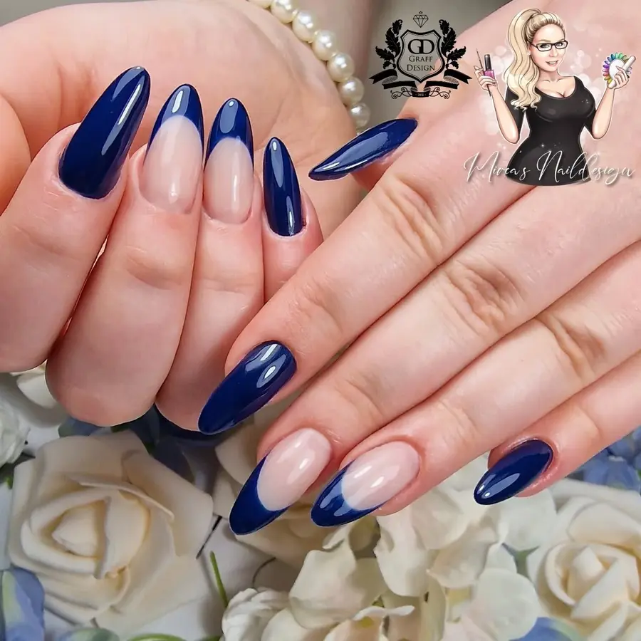 These dark blue nails feature classic French tips paired with a soft nude base for a clean, elegant contrast. The almond shape keeps the look refined while the glossy finish adds a modern touch. This design is perfect if you want something polished that still feels timeless and wearable.