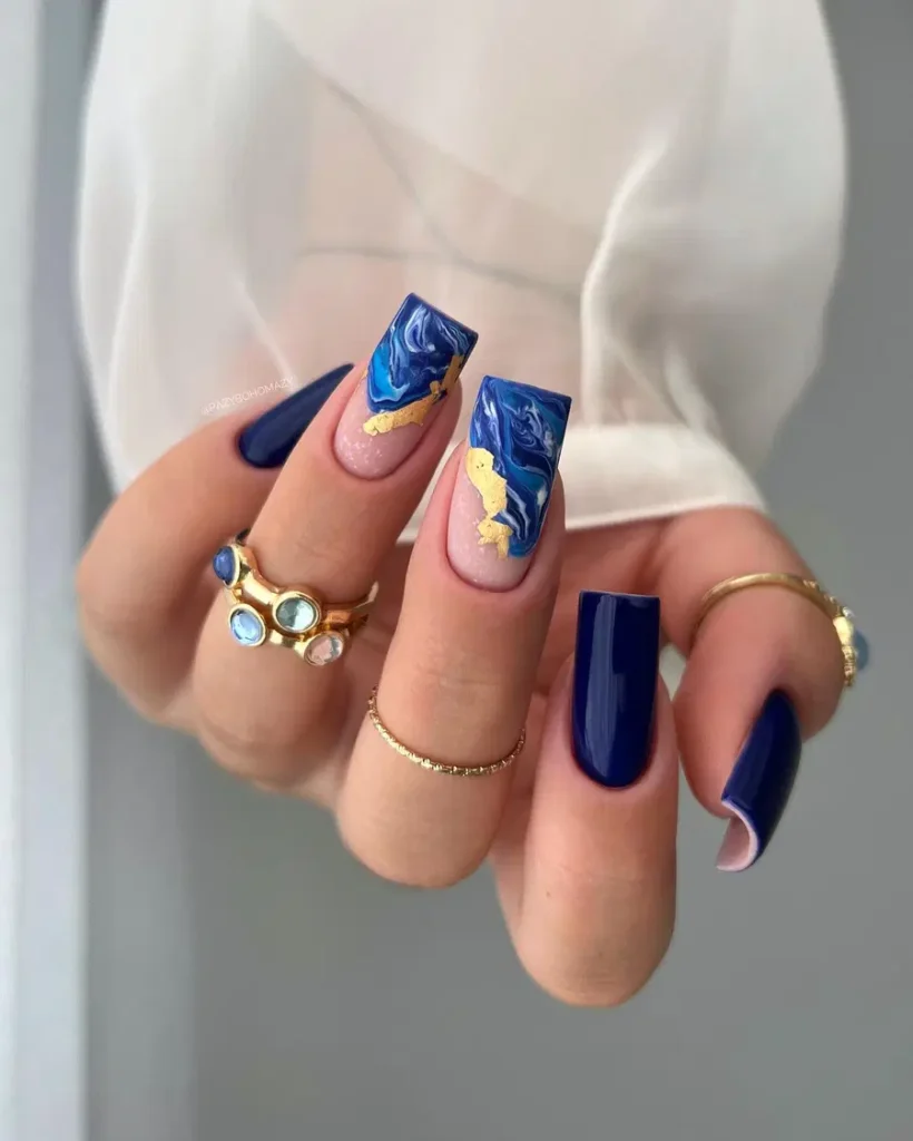 3. Dark Blue Marble Nails With Gold Foil Accents