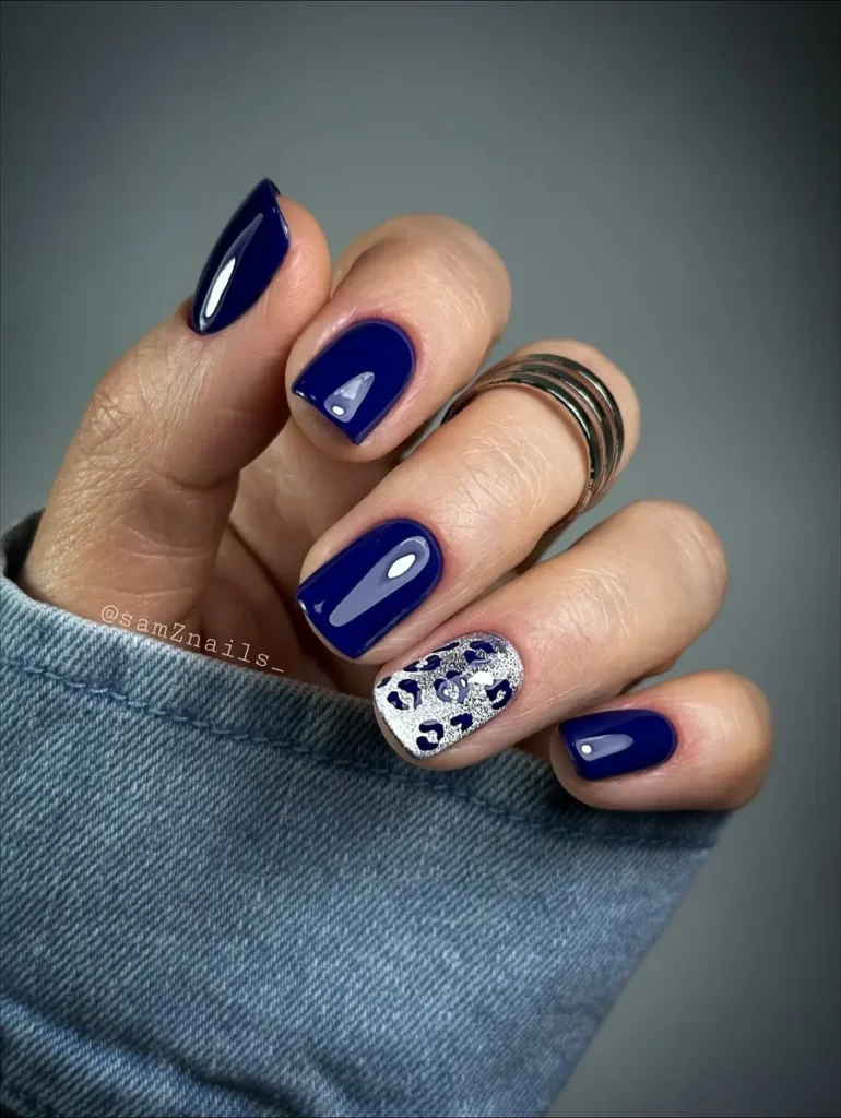 These dark blue nails keep the look sleek and modern with a high-gloss solid finish on most nails. A single silver leopard-print accent adds subtle texture and contrast without overpowering the overall design. The short, clean shape keeps the manicure polished, practical, and easy to wear for everyday style while still feeling intentional and refined.