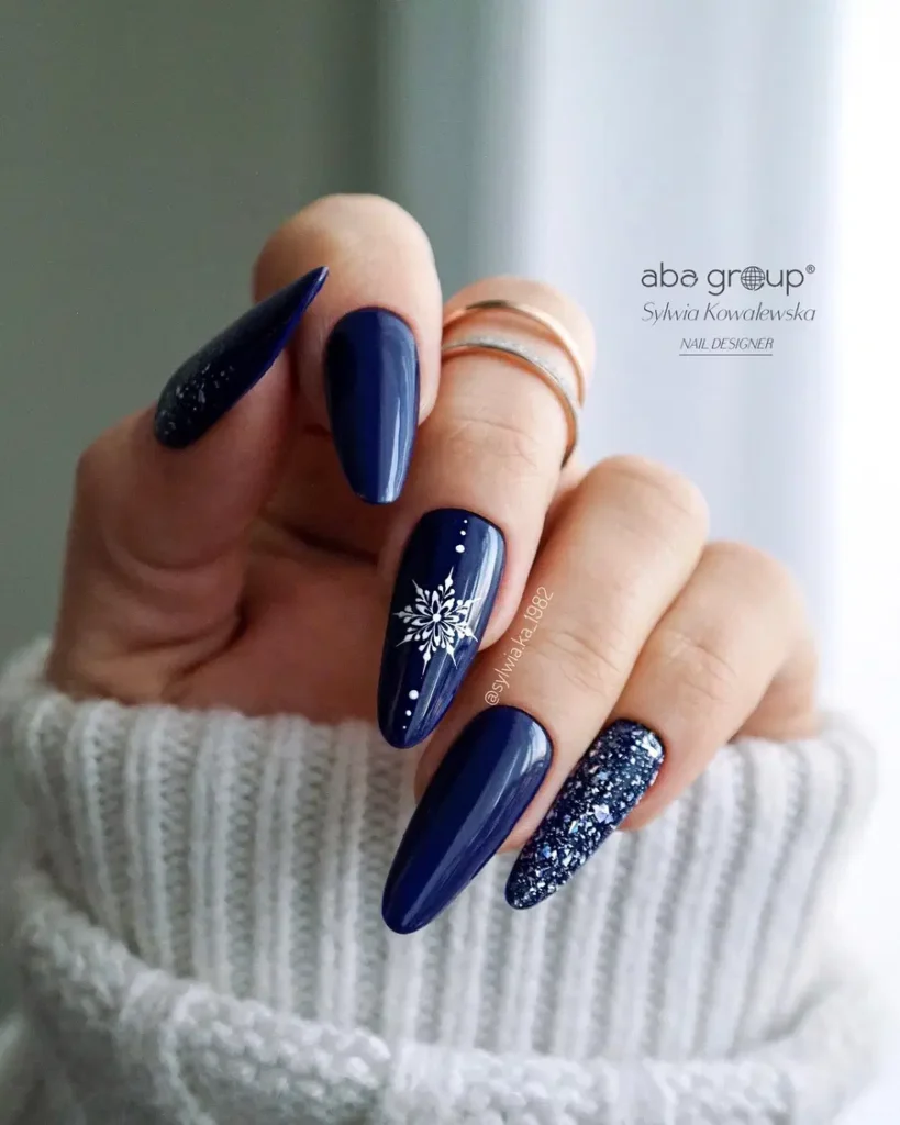 4. Dark Blue Almond Nails With Snowflake Detail And Glitter Accent