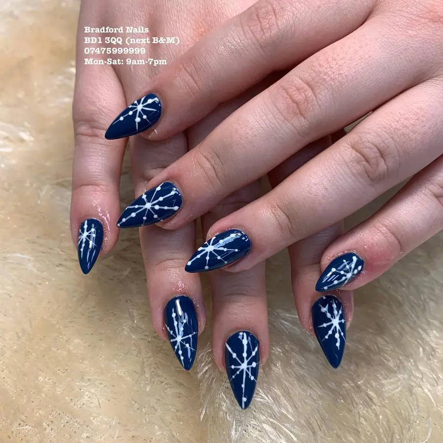 This bold manicure features sharp stiletto nails coated in deep navy blue, finished with crisp white starburst detailing. The contrast keeps the look artistic yet clean, making the design feel striking without appearing busy. A great option for modern dark blue winter nails with personality.