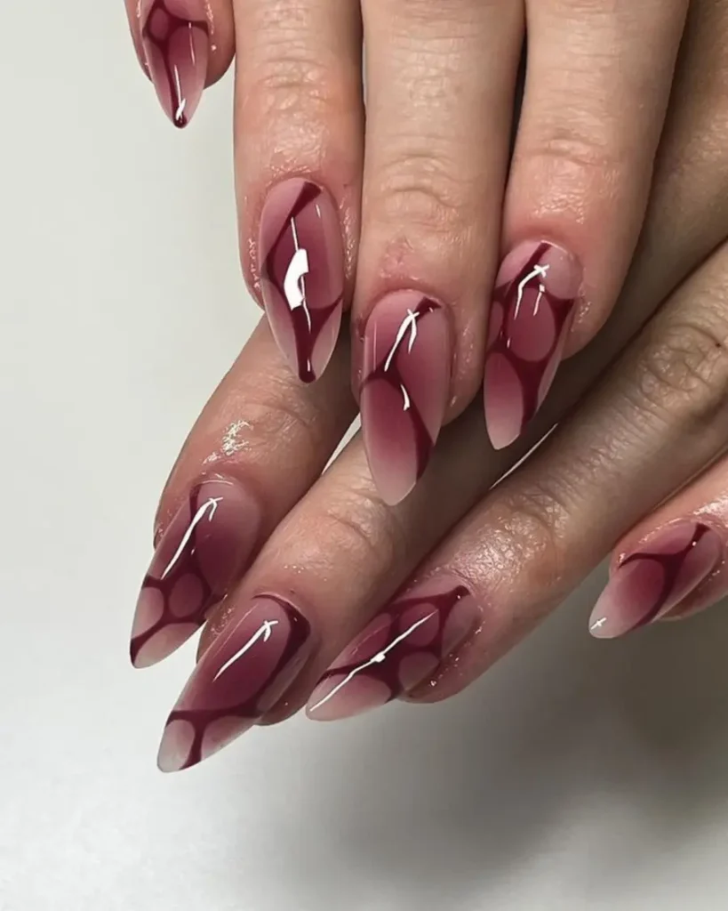 14. Moody Deep Red Abstract Nails With Glossy Finish