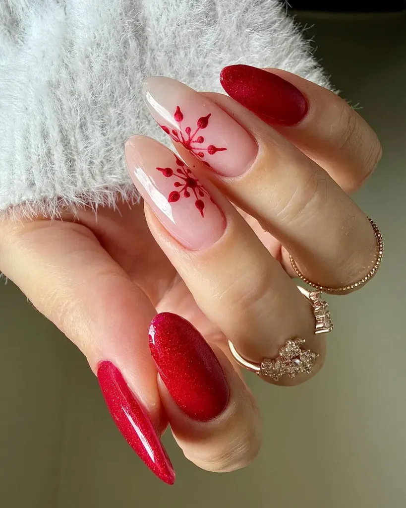 Bold deep red nails are paired with soft nude bases and delicate festive art accents for a refined seasonal look. The balance between solid red and detailed design keeps this manicure classy while still adding visual interest. It’s a great example of classy nails that feel festive, feminine, and wearable for everyday winter styling.