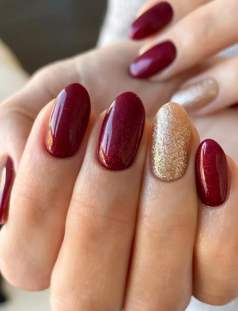 11. Deep Wine Red Nails With a Soft Golden Accent