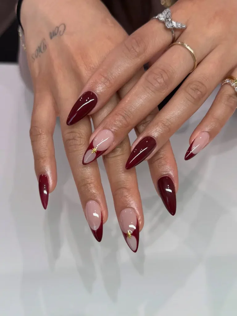 15. Deep Red Stiletto Nails With Minimal Gold Star Detail