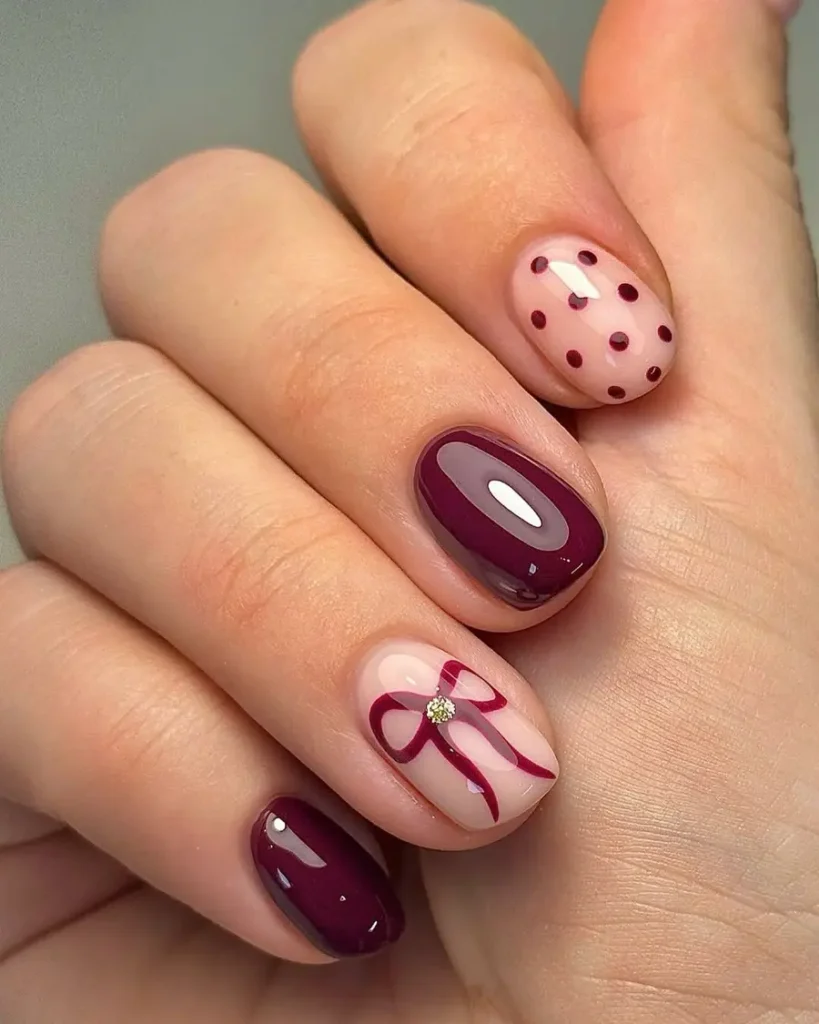Rich burgundy tones take center stage in this chic design, paired with subtle heart accents over a nude base. The combination feels romantic yet polished, making it ideal for everyday wear or special occasions. These deep red nails strike a beautiful balance between playful detail and classy simplicity.