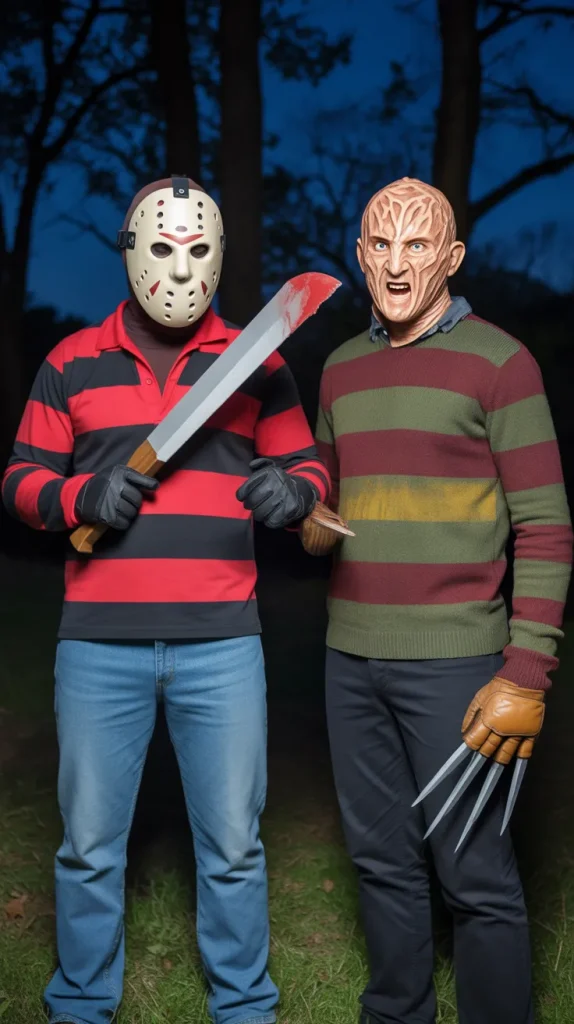 Now we’re talking full-on horror. Jason’s hockey mask and machete next to Freddy’s striped sweater and claw glove are instantly terrifying and totally iconic. This duo screams spooky season in the best way. If you’re into scaring people a little (but still keeping it fun), this is one of the best duo Halloween costumes to go for. You’ll be remembered for sure. 🔪