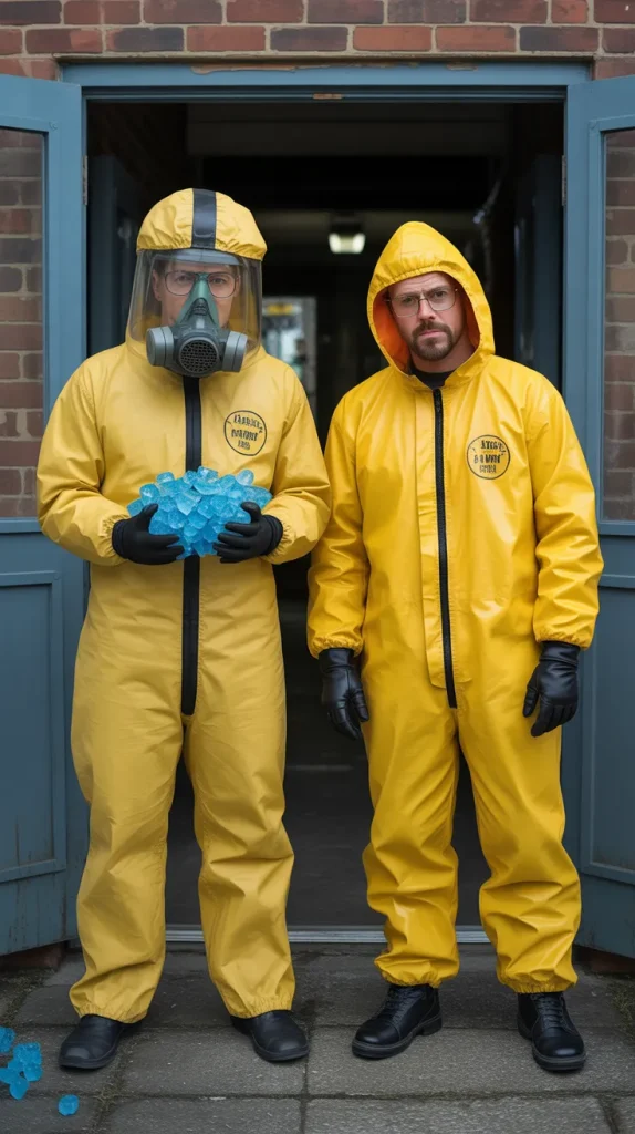 This one’s for the Breaking Bad fans. Hazmat suits, respirators, and blue crystal candy props create a look that’s instantly recognizable. It’s funny, dramatic, and honestly super comfortable since you’re basically wearing jumpsuits. IMO, it’s one of those halloween duo costumes that’s easy to pull off but still gets tons of compliments. 💊