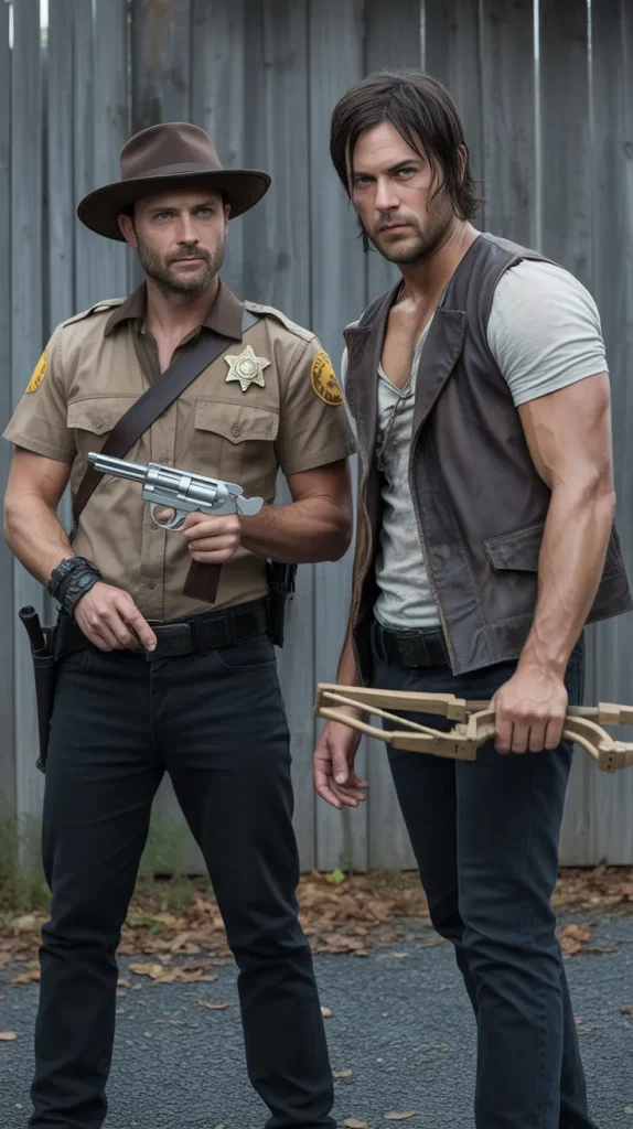 Zombie apocalypse vibes never fail on Halloween. Sheriff uniform, toy gun, leather vest, and crossbow instantly transform you into this dynamic duo. It’s gritty, cool, and definitely not your basic pick. If you want to feel like total survivors while still rocking a duo Halloween costume, this is the one. 🧟