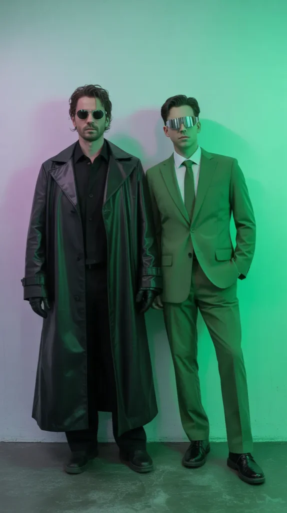 Finally, go cyber with Neo and Morpheus. Long trench coat, sunglasses, green suit the whole Matrix vibe is perfect for a late-night Halloween party. It’s edgy, iconic, and totally different from your average costumes. IMO, this one is for pairs who want to look effortlessly cool while still ticking the duo Halloween costumes box. 🕶️