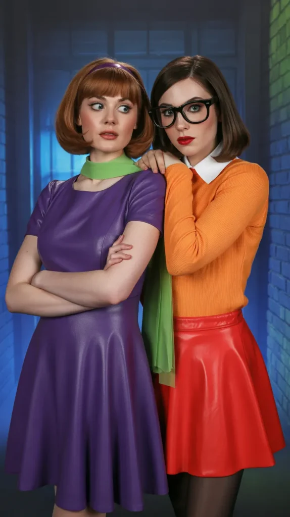 If you want a mix of retro charm and fun, go full Scooby-Doo. Daphne’s purple dress and green scarf next to Velma’s orange sweater and red skirt are instantly recognizable. Throw in some glasses, a magnifying glass, or even a stuffed Scooby prop for extra laughs. These two are proof that duo costume ideas don’t need to be scary to be Halloween-worthy. Want a look that’s both stylish and campy? This is it. 🕵️♀️