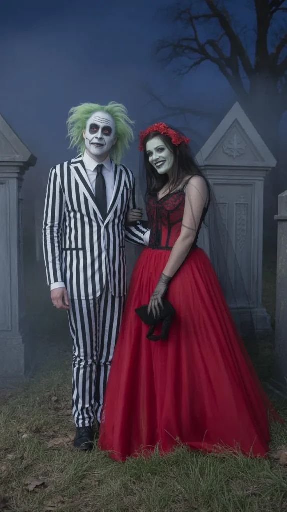 Want spooky but stylish? Beetlejuice and Lydia are your answer. The striped suit paired with Lydia’s gothic red wedding dress makes for a hauntingly chic combination. This Halloween couple costume works for friends or couples the vibe is dramatic, edgy, and always fun. Plus, it’s super easy to ham up the characters if you’re into acting things out. Who doesn’t love a little creepy glam? 🪦
