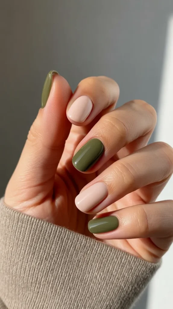 This combo is like the pumpkin spice latte of nail colors classic with a twist. Soft beige paired with earthy olive green creates a chic, natural vibe that works for both weekday coffee runs and weekend brunch.