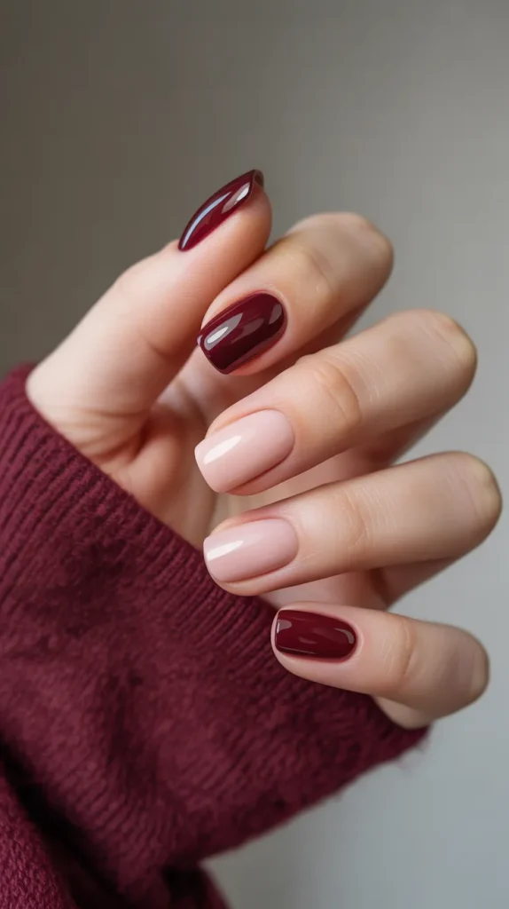 Can’t decide between simple and bold? Go with both! Alternating nude polish and deep burgundy nails gives you a balanced fall vibe without overthinking it.