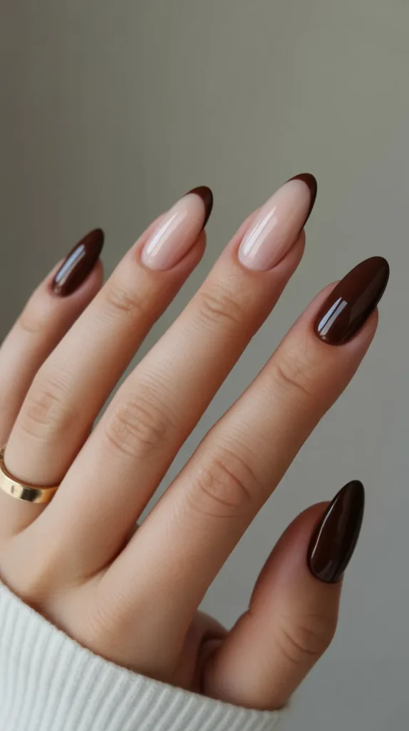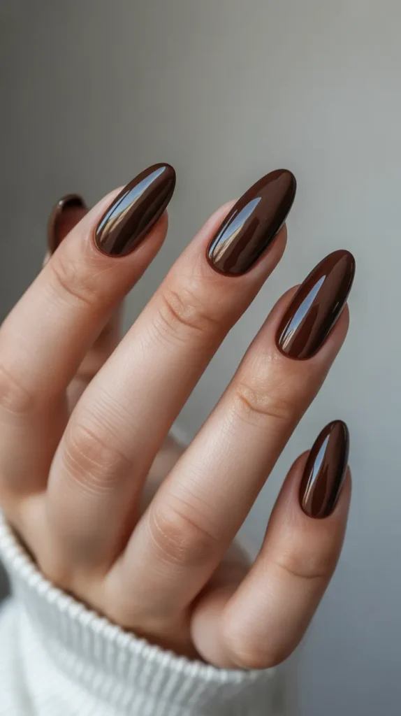 A classic fall staple. Glossy chocolate brown nails feel timeless, elegant, and effortlessly cozy.